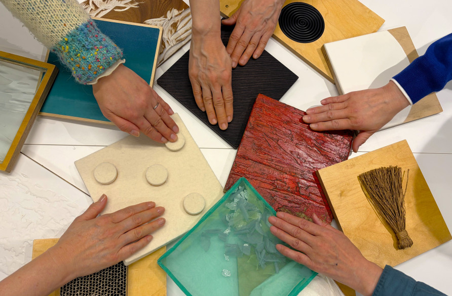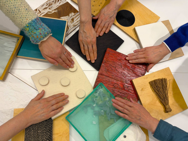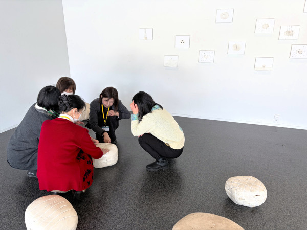 ひらくツール「ふれるアートカード」を使って、触覚や聴覚、いろいろな感覚をほぐしてから展示室で作品鑑賞をおこないます。