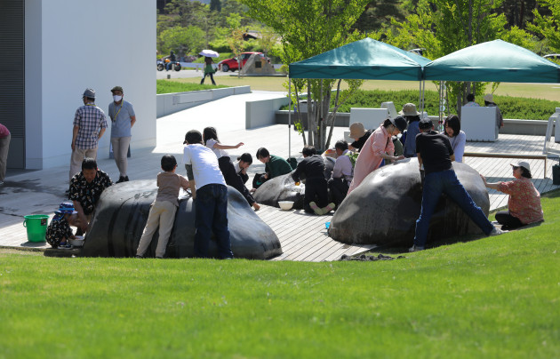 3つの巨石を来館者とともに磨く、石磨きワークショップを開催します。