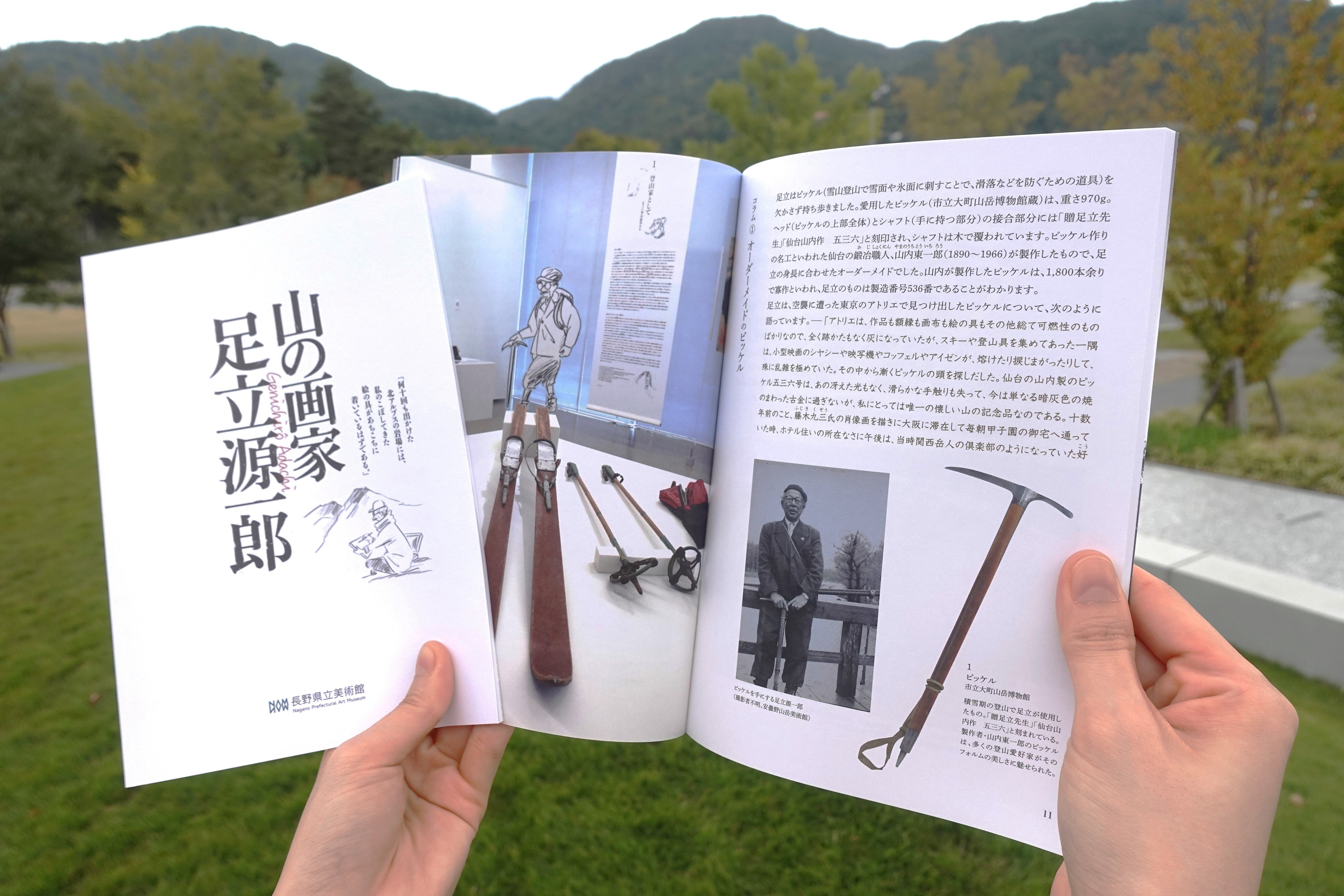 A5サイズ、フルカラー、34頁。定価は700円(税込)。展示の章解説やコラム、足立源一郎の愛用したピッケル、リュックといった登山道具や長野の山々を描いたスケッチの図版などをイラストとともに楽しく紹介しています。足立が巡った日本各地の登山マップも掲載。